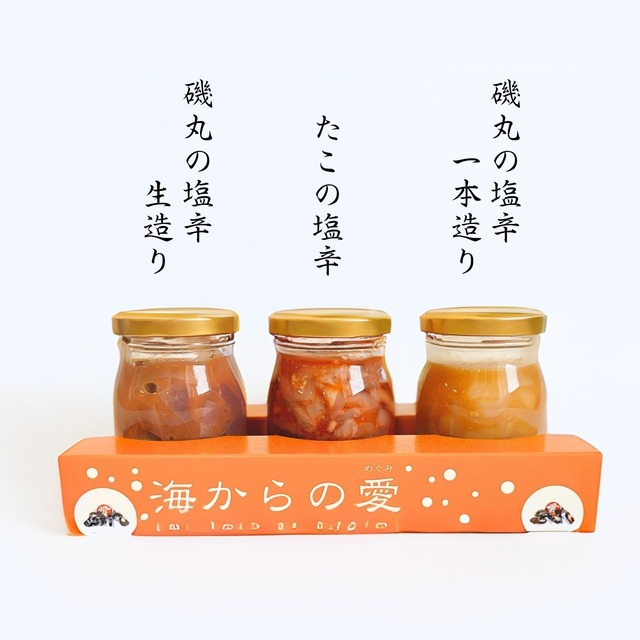 【オンラインショップ限定セット】 プチ瓶食べきりサイズの詰め合わせ。 3つの味をお楽しみいただけます! ちょっとした贈り物にも便利な、クリアBOXに入れてお届けです。 ・磯丸の塩辛(昔ながらの一本造り) 塩味の効いた、イカ丸ごと一杯(一本)使った食べ応えのある塩辛。 ・たこの塩辛 素材の旨味をかんじる、ちょっと甘めの塩辛。 ・いかみみキムチ いかのみみ(エンペラー)の歯ごたえが最高! 【内容量】各90g×3本 【保存方法】冷蔵(10℃以下) ●磯丸の塩辛(昔ながらの一本造り) 【賞味期限】35日間 【栄養成分/100g当り】 エネルギー:119Kcal たんぱく質:10.8g 脂質:0.9g 炭水化物:17.0g 食塩相当量:5.0g(推定値) 【原材料】 いか(インド・スリランカ産)、いかの腑(国内産)、発酵調味料、食塩/ソルビトール、調味料(アミノ酸)、酒精、増粘多糖類、甘味料(ステビア、甘草)、紅麹色素、パプリカ色素、ラック色素、(一部にいかを含む) ●たこの塩辛 【賞味期限】21日間 【栄養成分/100g当り】 エネルギー:85Kcal たんぱく質:12.8g 脂質:0.3g 炭水化物:7.8g 食塩相当量:4.6g(推定値) 【原材料】 いいだこ(ベトナム産)、発酵調味料、食塩、本味醂、唐辛子/ソルビット、酒精、調味料(アミノ酸等)、増粘多糖類、着色料(パプリカ色素) ●いかみみキムチ 【賞味期限】21日間 【栄養成分/100g当り】 エネルギー:110Kcal たんぱく質:16.6g 脂質:1.9g 炭水化物:6.7g 食塩相当量:6.4g(推定値) 【原材料】 いか(中国又は国産又はアルゼンチン)、発酵調味料、食塩、ニラ、還元水飴、唐辛子、にんにく、りんご、醸造酒、水飴、ごま、ぶどう糖果糖液糖、豆板醤、生姜、エビエキス/調味料(アミノ酸等)、酒精、着色料(パプリカ色素)、グリシン、増粘多糖類、甘味料(ステビア)、リン酸塩(Na)、酵素、(一部にいか・りんご・ゴマ・大豆・小麦・エビ・豚肉・卵を含む)