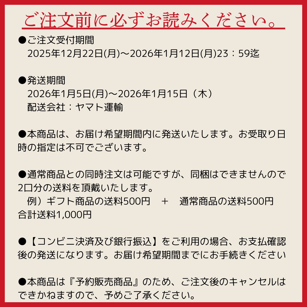 ●発送期間:2026年1月5日(月)~2026年1月15日(木)